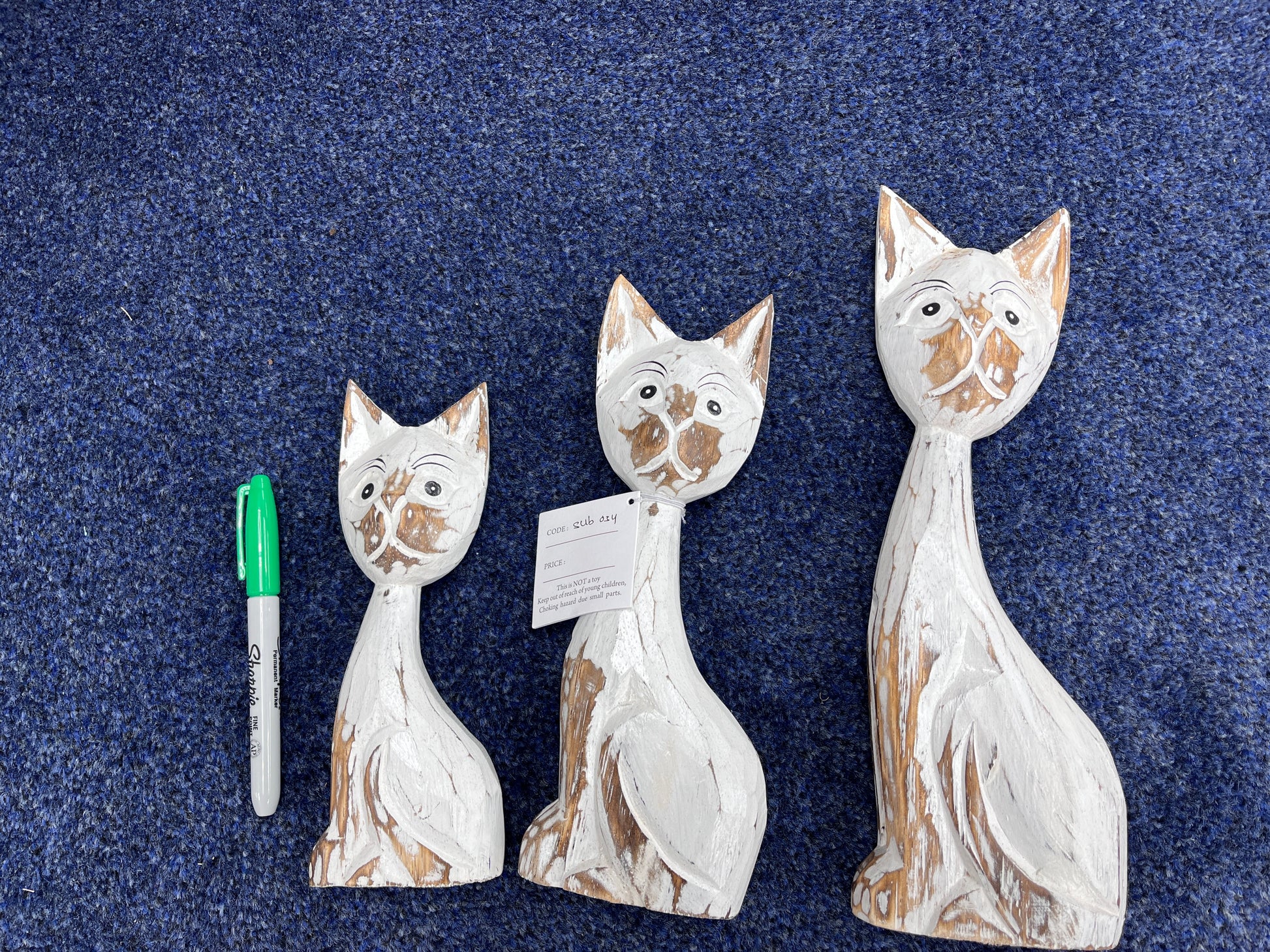 Bring a little charm to your space with this handmade wooden cat trio. Each cat is hand-carved and hand-painted, so every piece has its own personality and small unique details. They look great on shelves, desks, or as a cute gift for any cat lover.